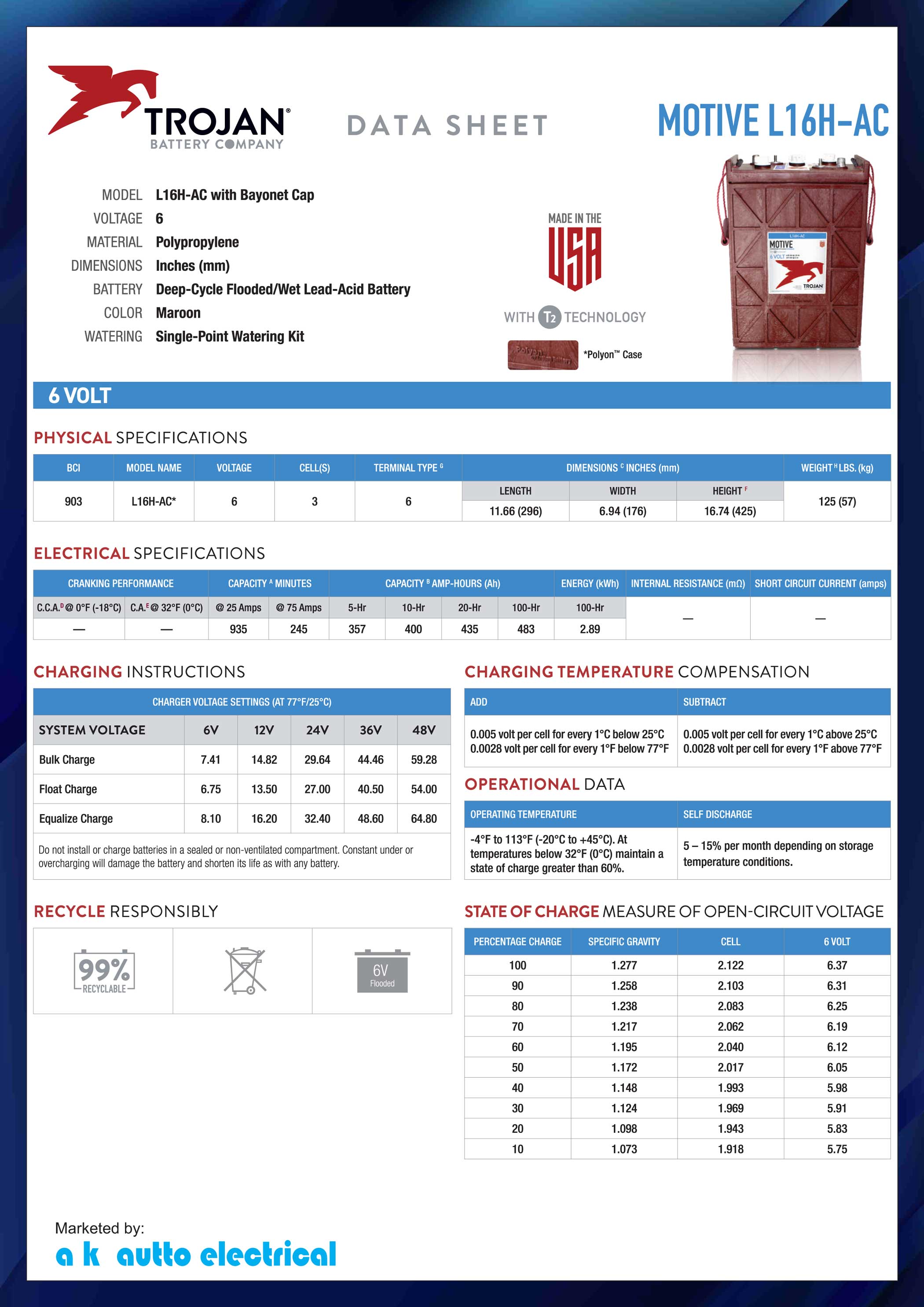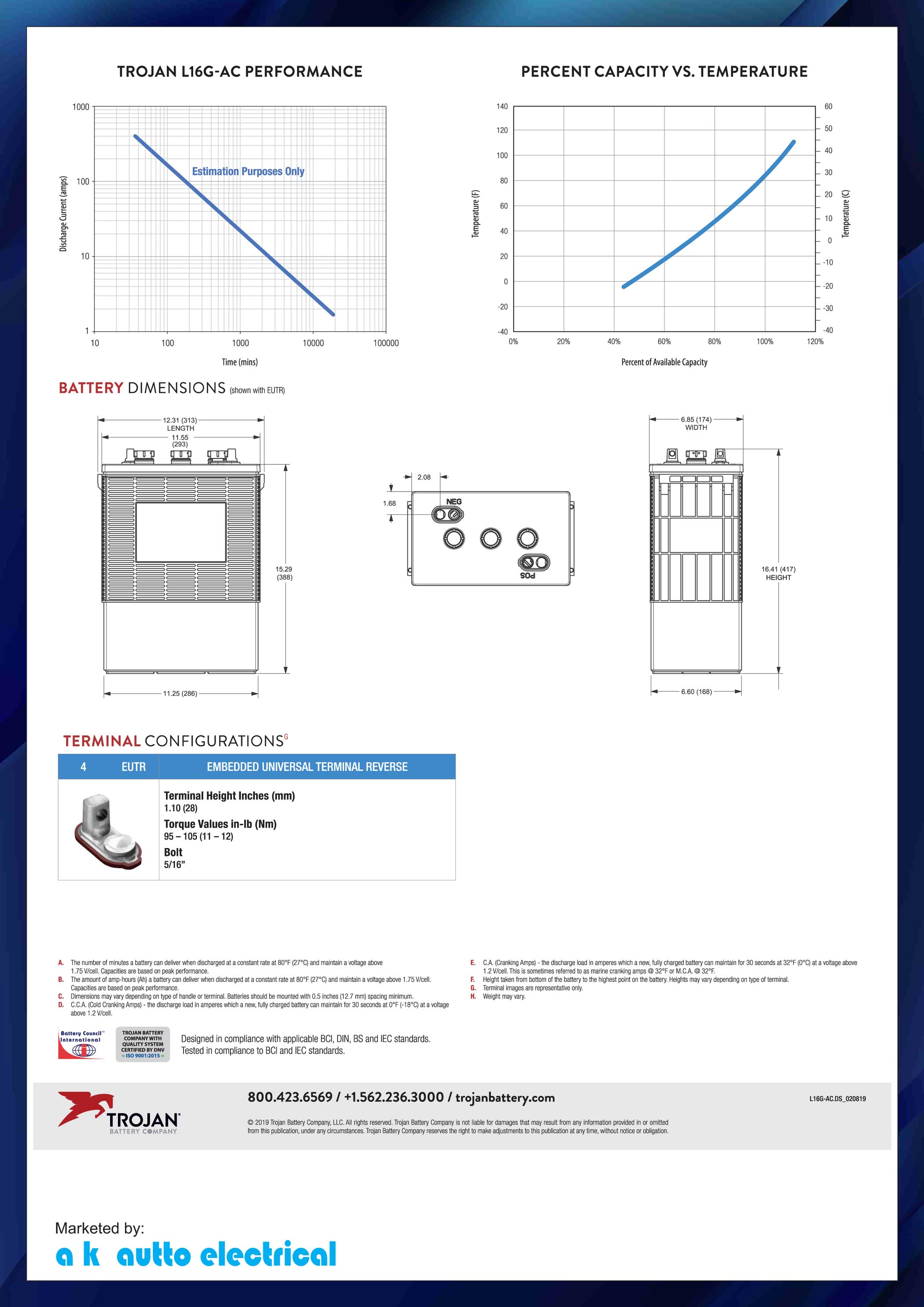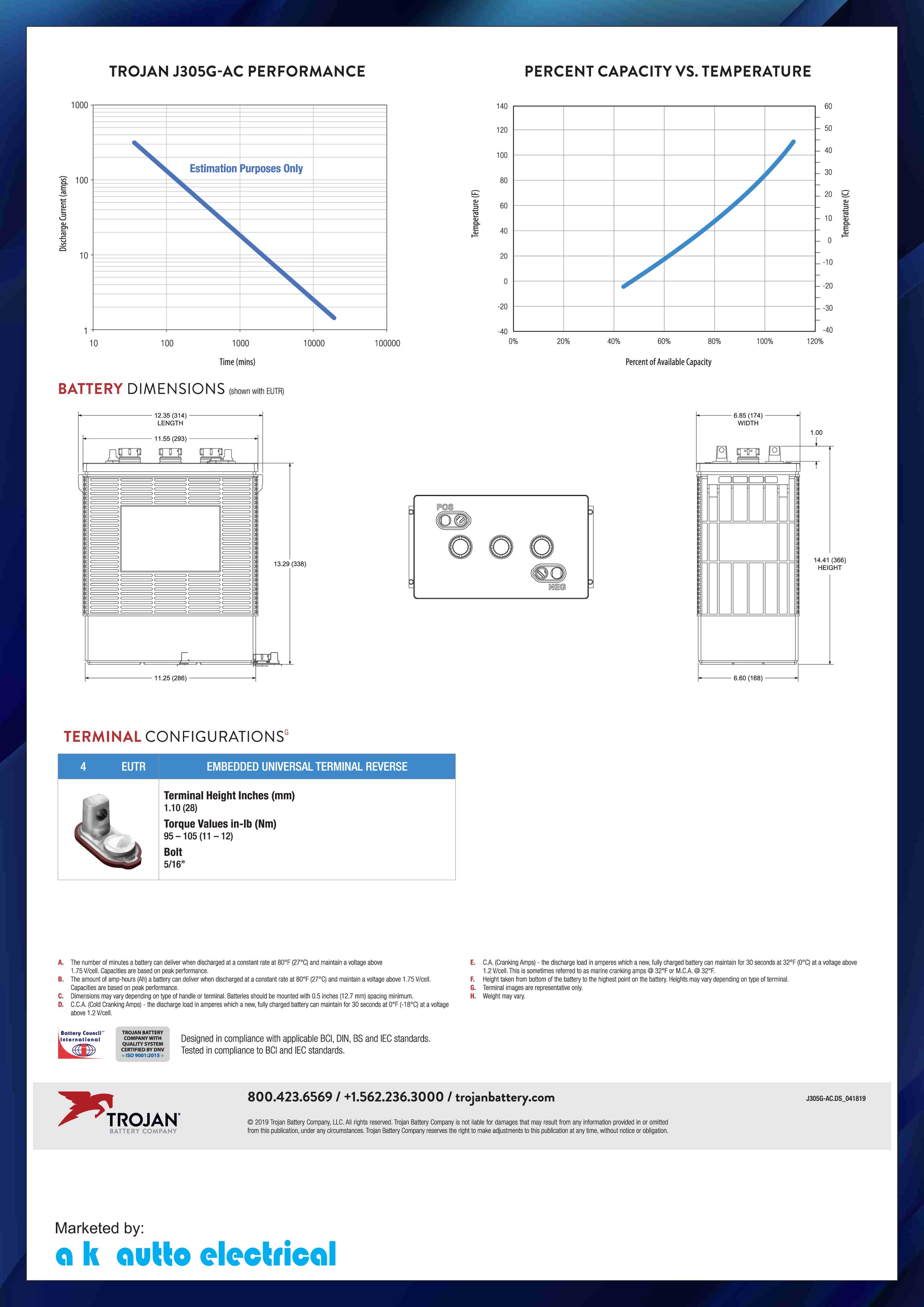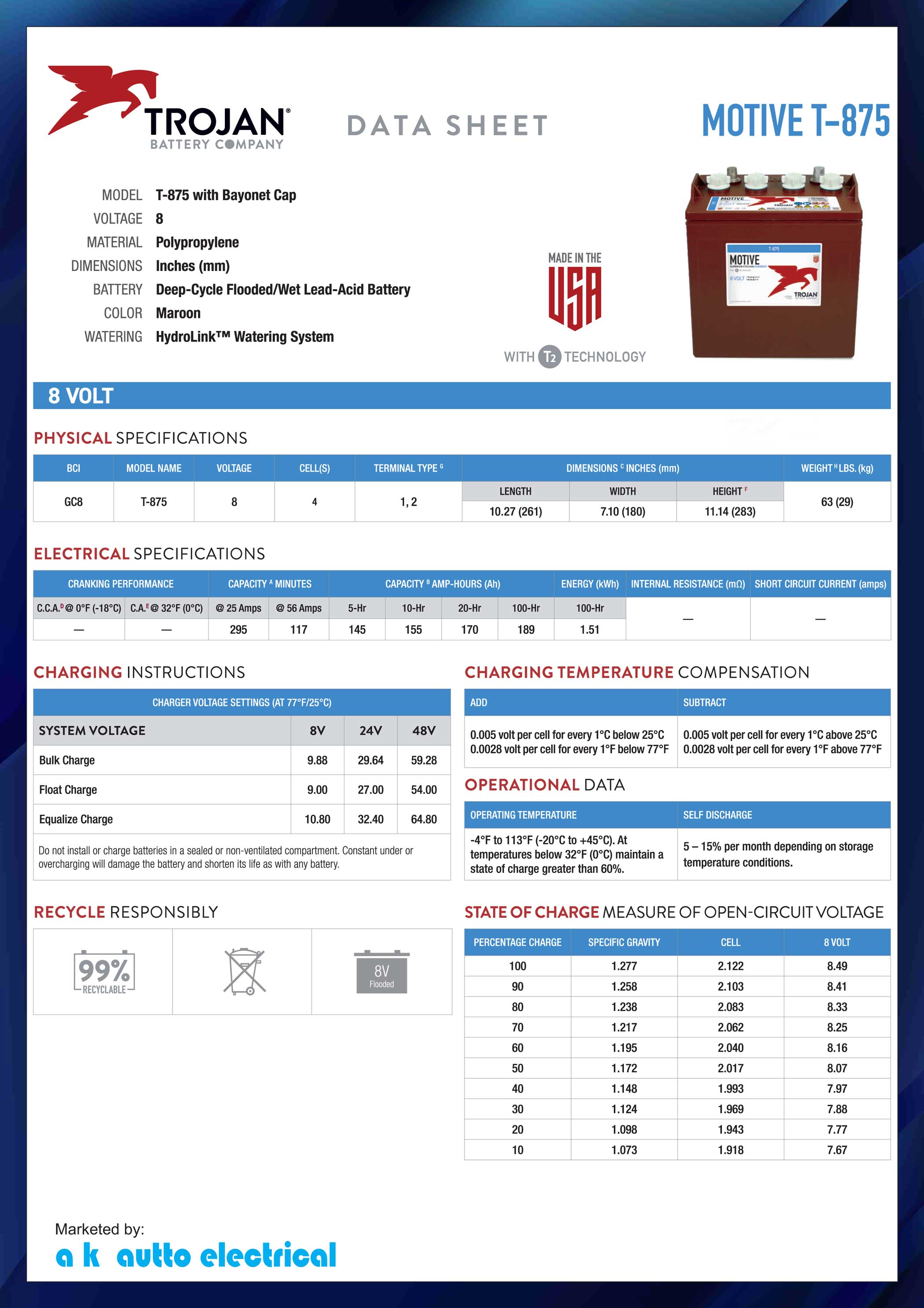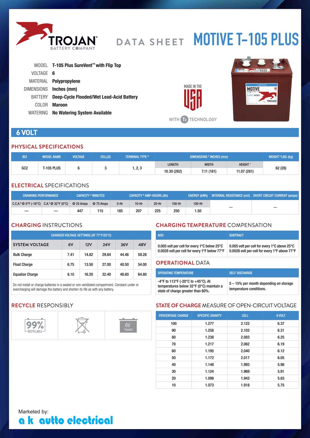 The Trojan Flooded Lead Acid Battery delivers high capacity and high energy