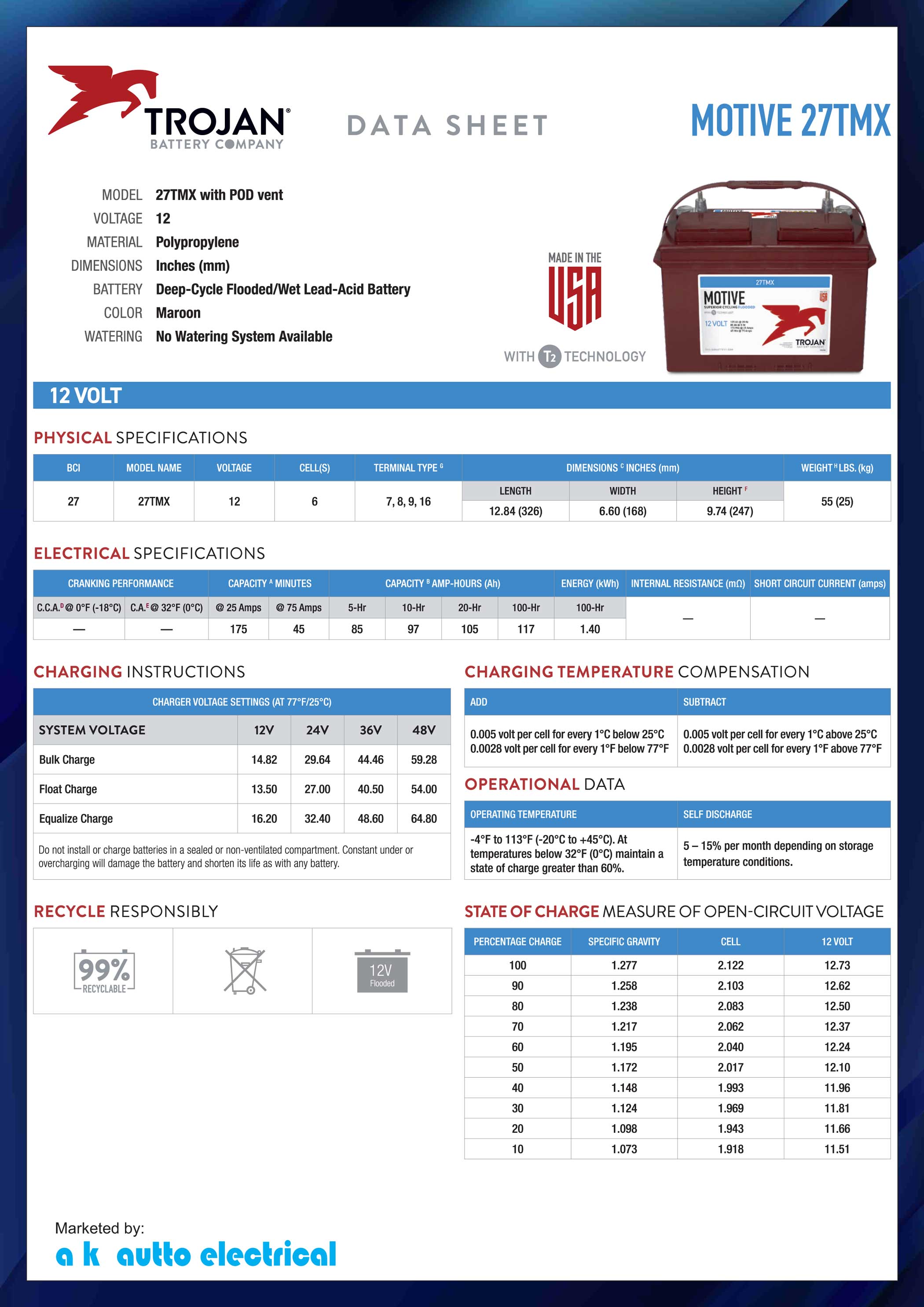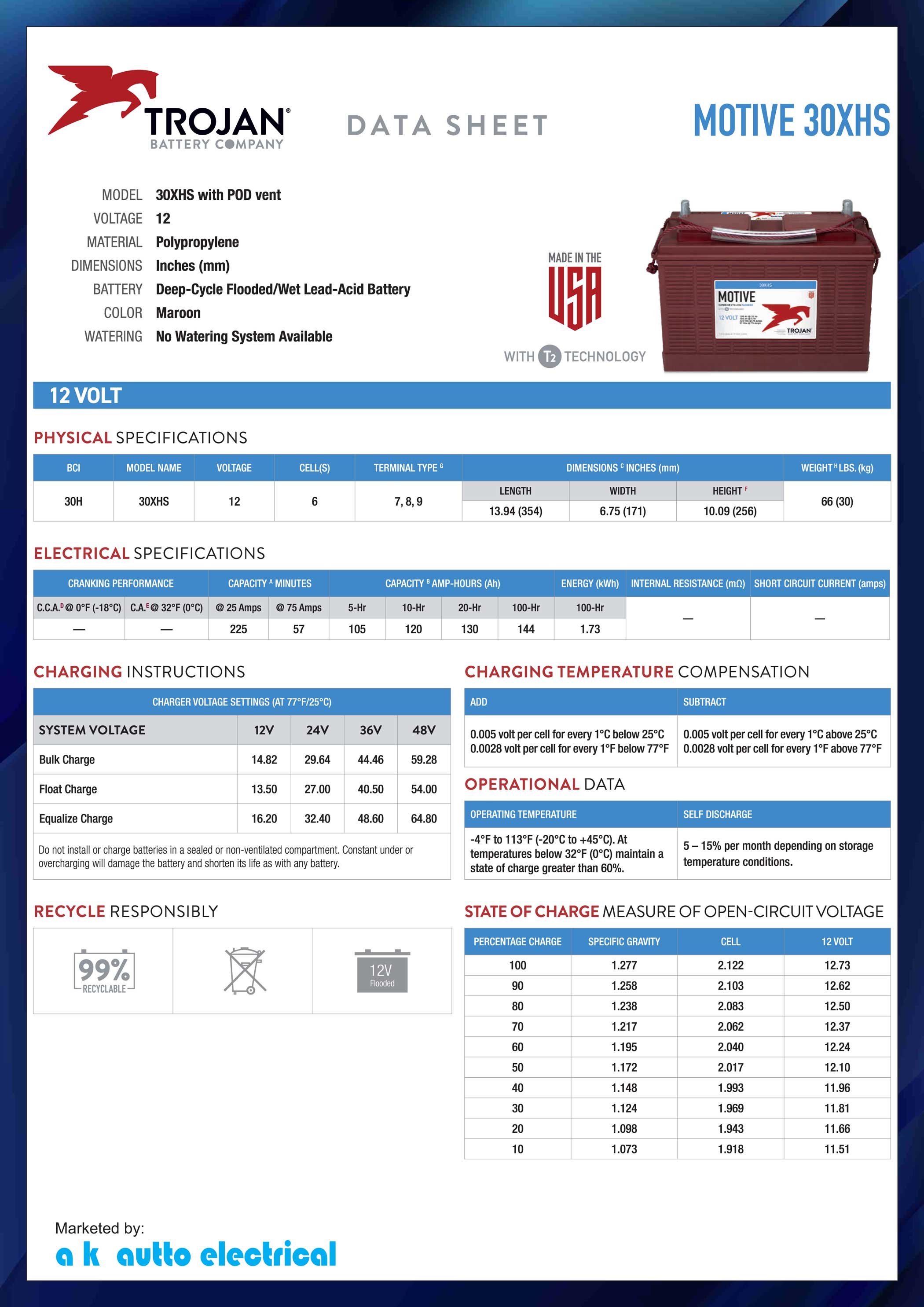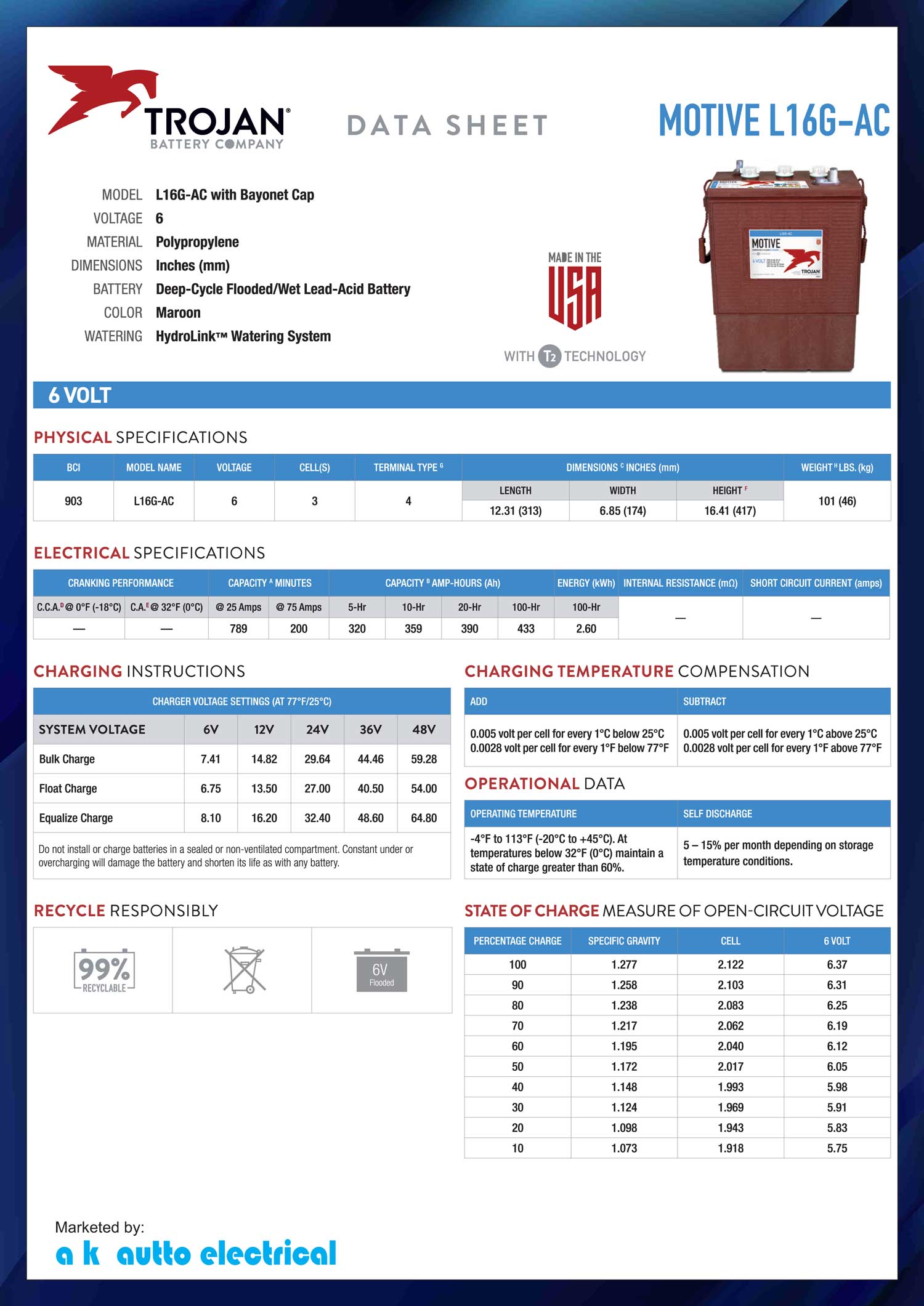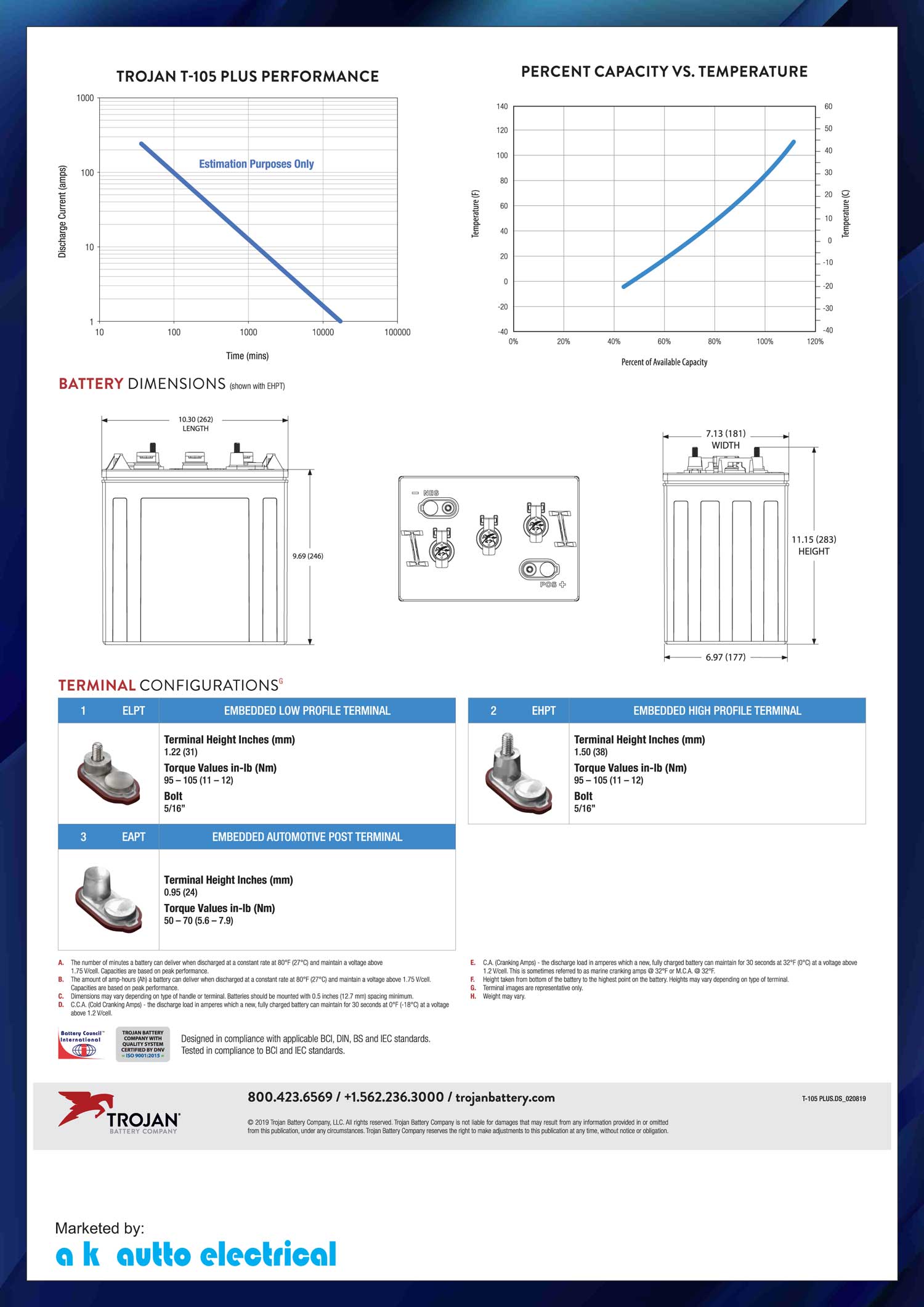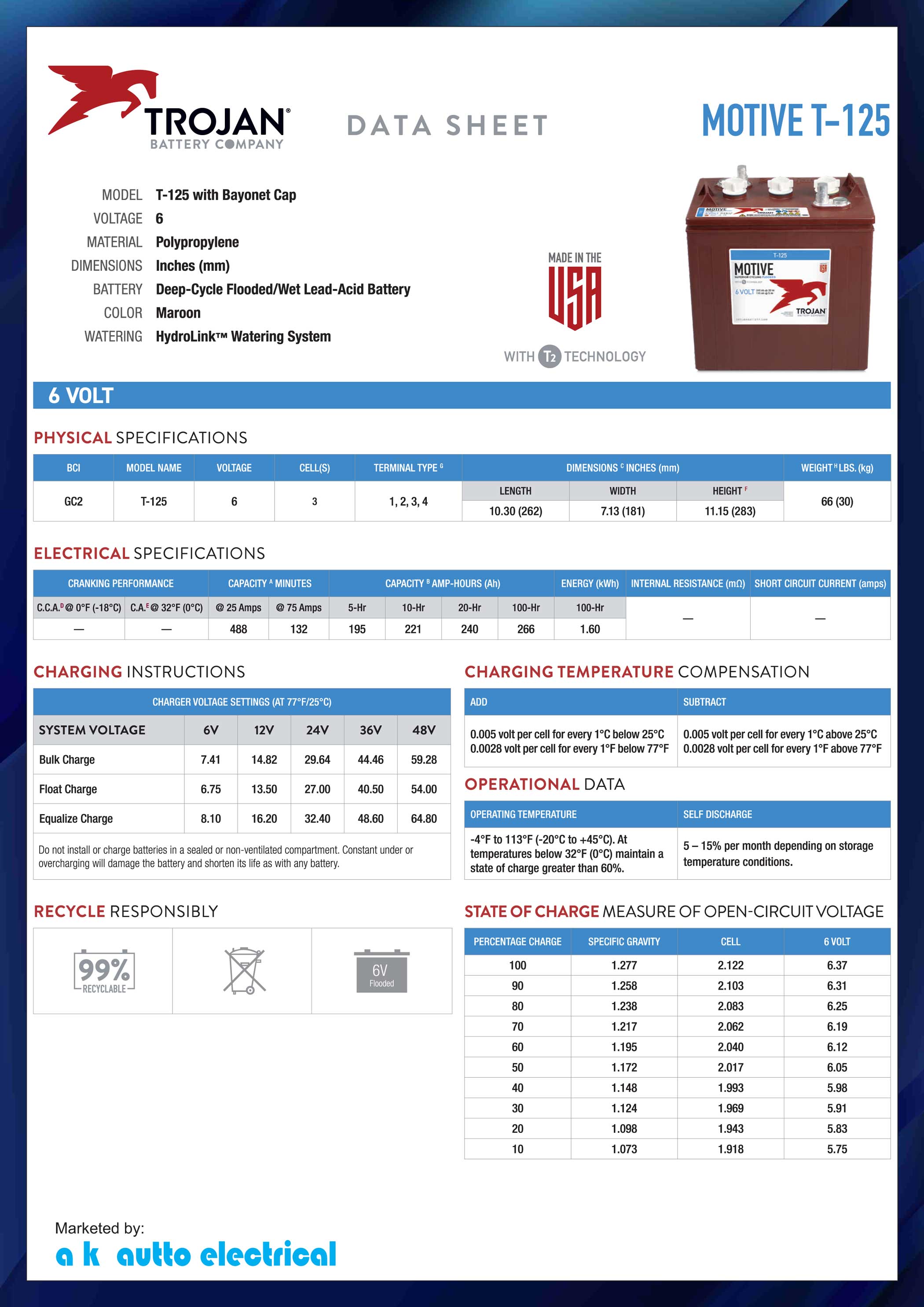 The Trojan Flooded Lead Acid Battery delivers high capacity and high energy